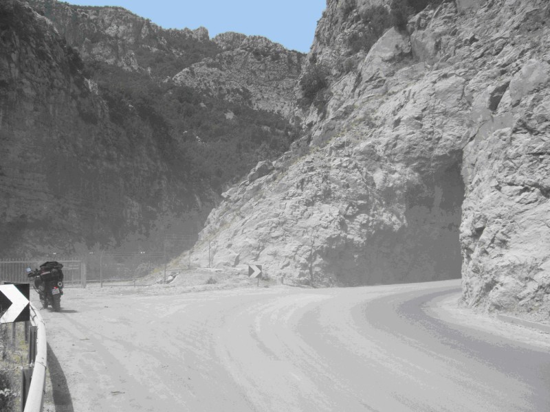 ![]() Ale dost rozjímání, je potřeba zmáčknout startér, motor přátelsky zabrumlá a mašina vyrazí vpřed. Co to je? Tunel ve skále? Ale jaký!!!! To není tunel. To je vystřílená díra doprostřed horského masivu. Stěží se do ní vejdou dvě auta vedle sebe. A na zemi místo asfaltu taky kámen. Jsem utahaný a zlehka vydeptaný. Ve snaze vyhnout se krávě náhle se vynořivší v kuželu světla pokládám Stroma na bok. Nic vážného. Pomalu ho zvedám. Bágly zkontroluji až venku, protože kromě paprsku z reflektoru je v tunelu absolutní tma.