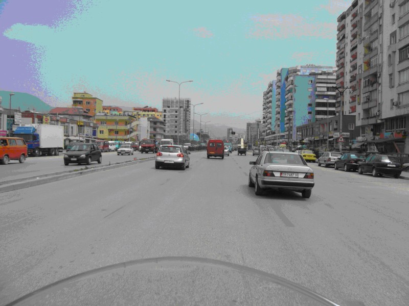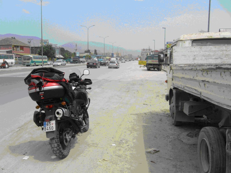 ![]() Kolem 13.00 se napojuji na Autostrade. Do Tirany je to asi 60 km. Vcelku nuda, jedna vesnice jak druhá. Šeď, špína, nic zajímavého. Vjezd do Tirany od severu je šokující. Asfaltová Autostrade se mění v prašnou rozbitou polňačku se spoustou osobních aut i náklaďáků. Tak to snad není pravda. Tohle má být příjezd do hlavního města??? Ano, je to bohužel tak. Kvalitní, nebo alespoň jakž takž asfalt mají v Albánii spíš silnice, které třeba před 5ti, 10ti lety vůbec neexistovaly. A ty co existovaly, tak ty už byly a jsou a není potřeba na ně plýtvat novým asfaltem. Ale abych Tiraně nekřivdil. Všude se čile staví, už cca po 500 metrech je vidět, že zanedlouho se prašný hnus změní v novou moderní čtyřproudovou silnici á la pražská D1. Jenom škoda, že jim nikdo neřekl, že zatáhnout si dálnici do centra skutečně není ten nejlepší nápad.