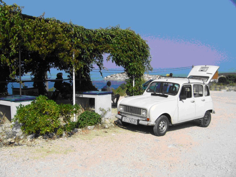 ![]() Řeknu Vám, posezení v téhle vesnici bylo přesně to, co si představuji pod pojmem On the road bez ohledu na místo a čas. Z krátké zastávky se vylouplo 3-í hodinové posezení. Pouze jsem seděl na terase zmíněného café baru a vychutnával si nudné a vlekoucí se prázdninové odpoledne. Džus střídal minerálku, četl jsem průvodce a pozoroval domorodce v naprosté pohodě a bez stresu klábosící tu u barového stolku, tu u zmiňované sámošky, každopádně určitě nikam nespěchající. Ospalou náladu pravidelně narušoval pouze místní tuner se svým trojkovým Golfem s utrženým (vytuněným) výfukem.